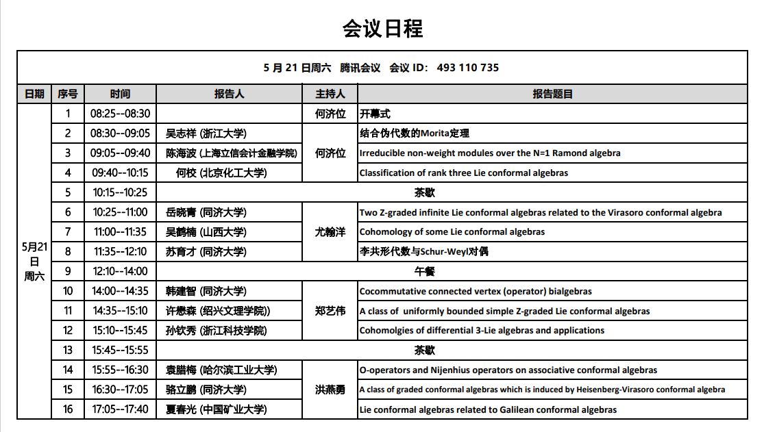 共形代数及相关问题研讨会日程安排-5-21