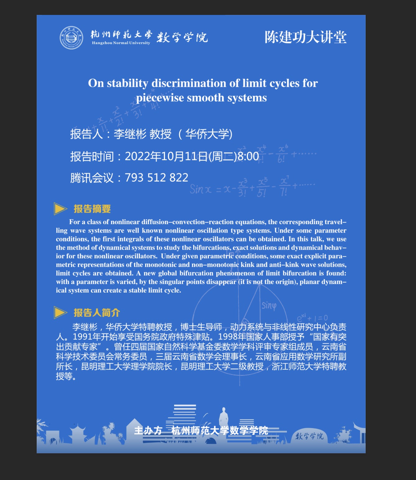 陈建功大讲堂:On stability discrimination of limit cycles for piecewise smooth systems