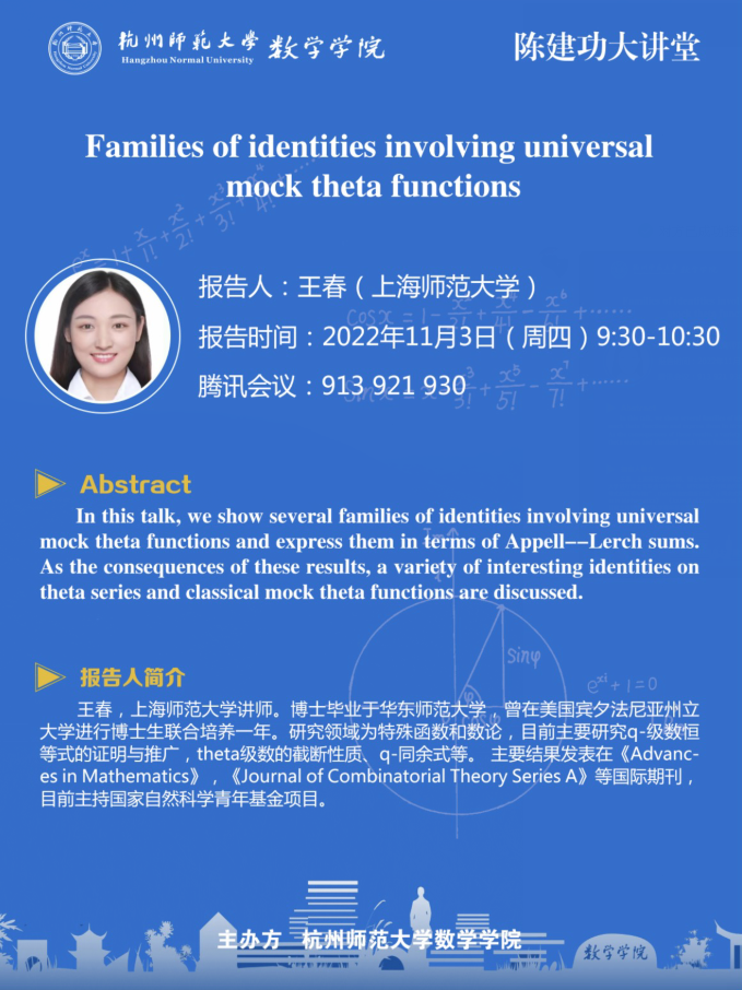 陈建功大讲堂:Families of identities involving universal mock theta functions