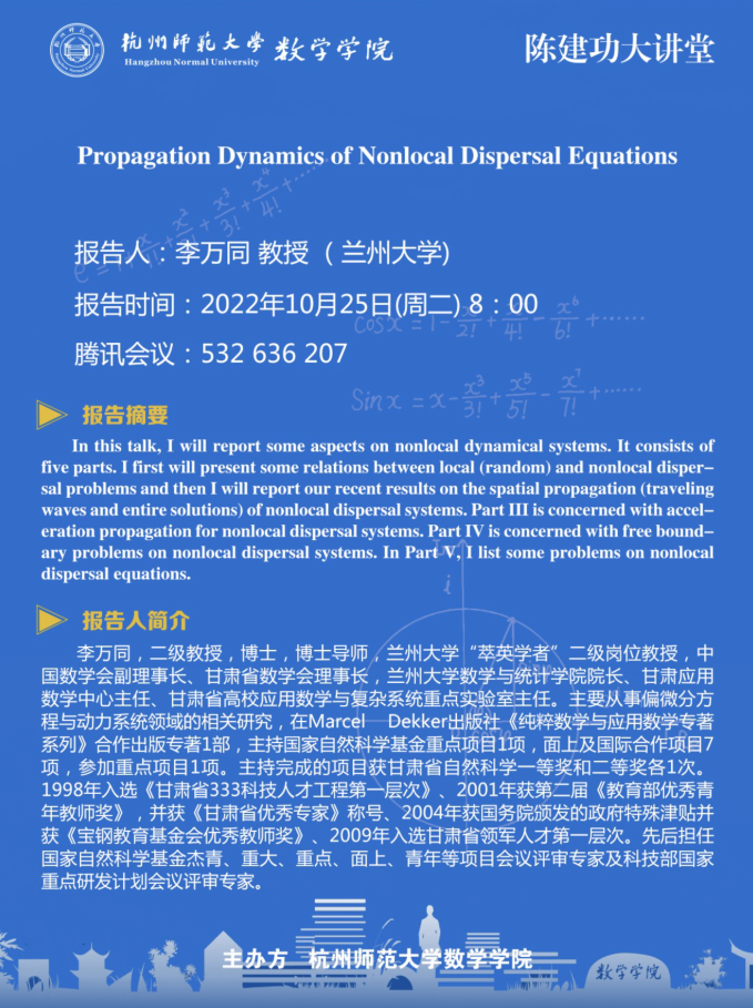 陈建功大讲堂: Propagation Dynamics of Nonlocal Dispersal Equations