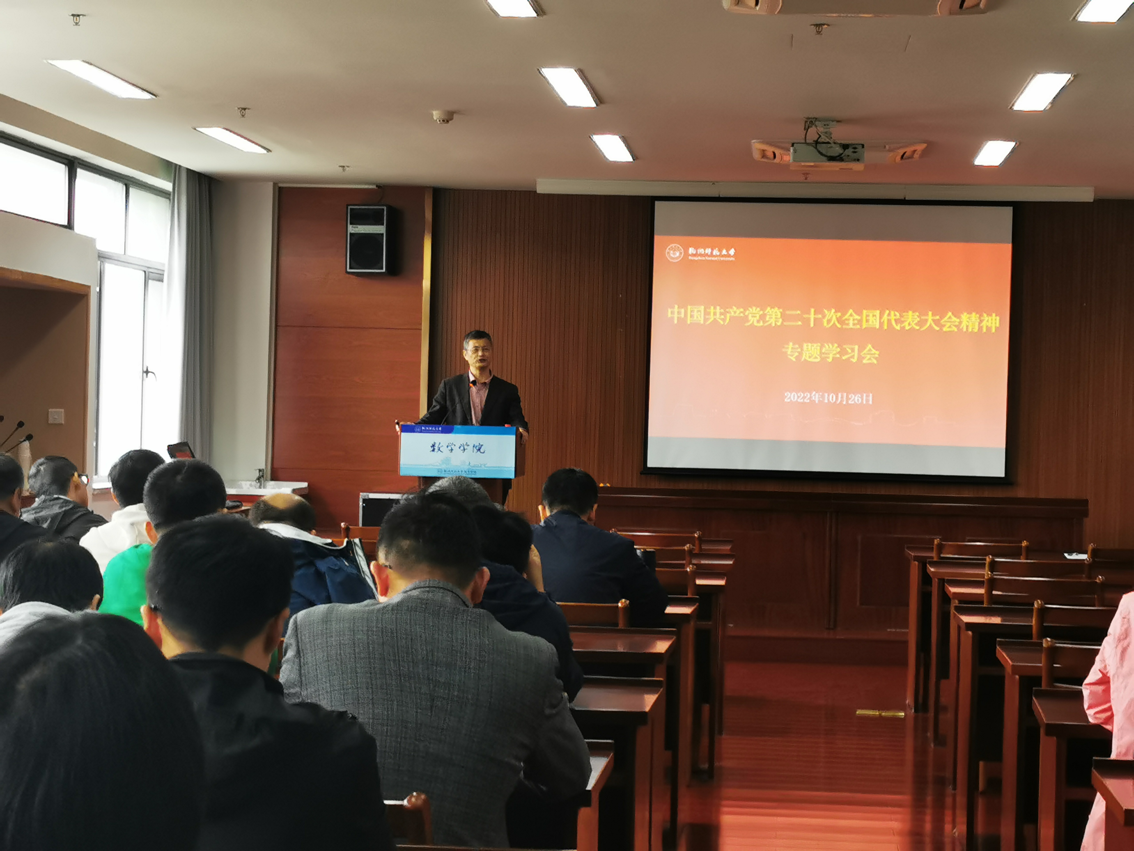 10月26日,学院召开传达学习党的二十大精神专题学习会,学院党委书记徐金芳主持会议并传达党的二十大精神,全体教职工参加。会议就党的二十大基本情况、重要意义、报告主要内容等进行学习,对学院学习好、贯彻好、落实好党的二十大精神进行部署。