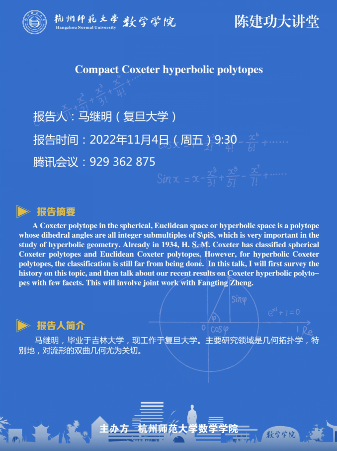 地址:浙江省杭州市余杭塘路2318号勤园23号楼 电话:0571-28867633 邮编:311121 版权所有 © 2021 杭州师范大学数学学院 公安备案号:33011002011919 浙ICP备11056902号-1