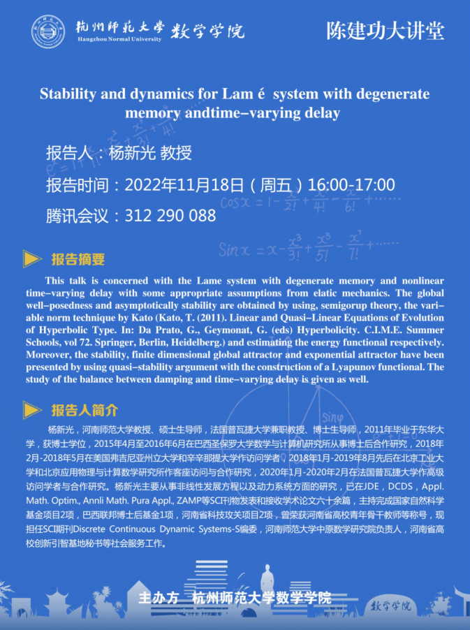 陈建功大讲堂: Stability and dynamics for Lamé system with degenerate memory and time-varying delay