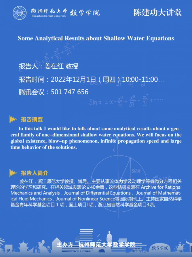 陈建功大讲堂:Some Analytical Results about Shallow Water Equations