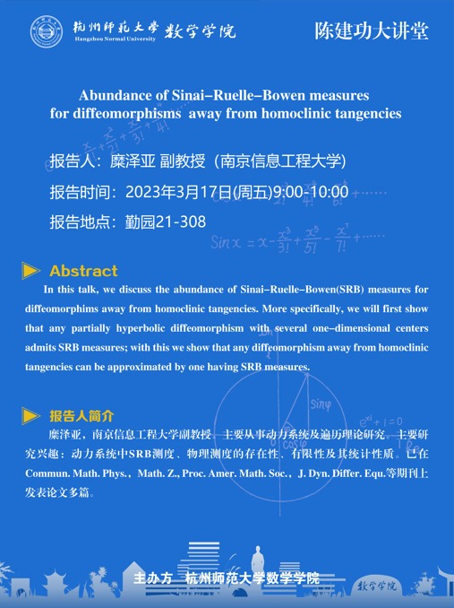 陈建功大讲堂:Abundance of Sinai-Ruelle-Bowen measures for diffeomorphisms away from homoclinic tangencies