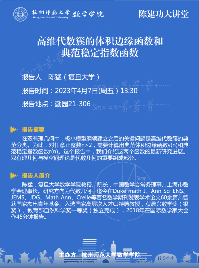 陈建功大讲堂:高维代数簇的体积边缘函数和典范稳定指数函数
