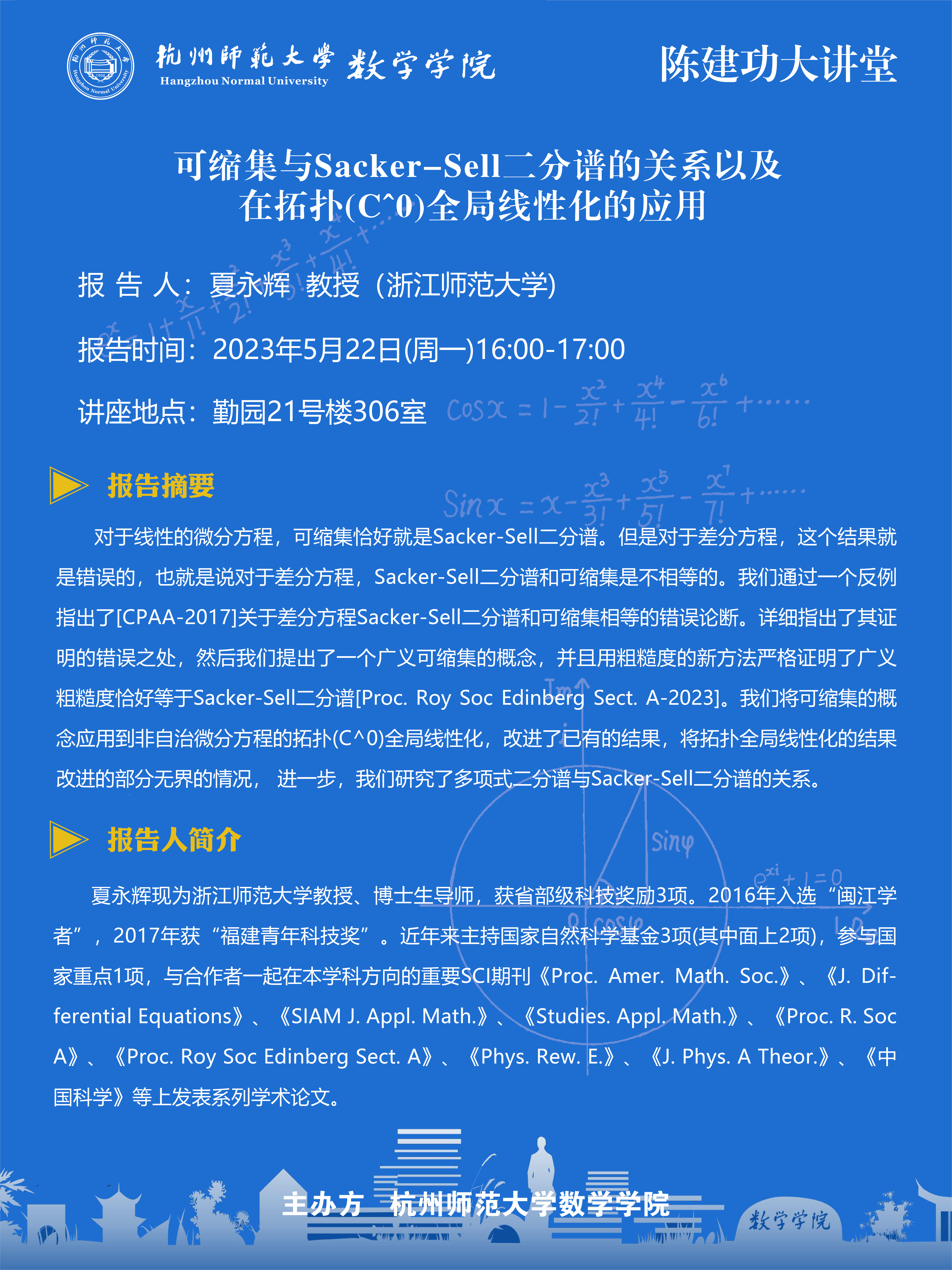 陈建功大讲堂:可缩集与Sacker-Sell二分谱的关系以及在拓扑(C^0)全局线性化的应用