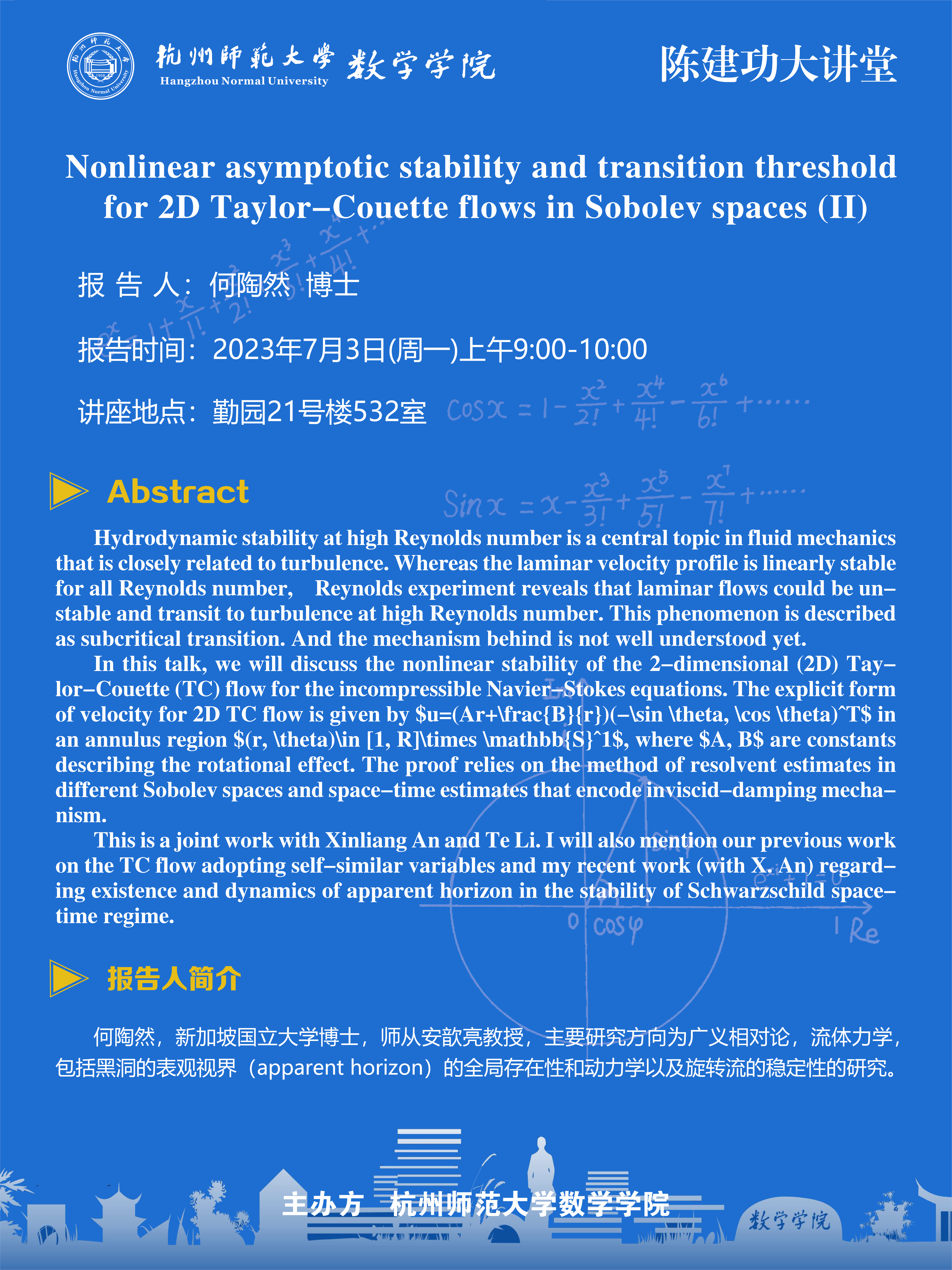 陈建功大讲堂:Nonlinear asymptotic stability and transition threshold for 2D Taylor-Couette flows in Sobolev spaces (II)