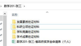3.申请的同学请填写 附件3 数学学院省政府奖学金申请表(个人) ,与相关佐证材料整理打包,文件夹命名为“班级-姓名”,佐证材料汇总方式如图所示: