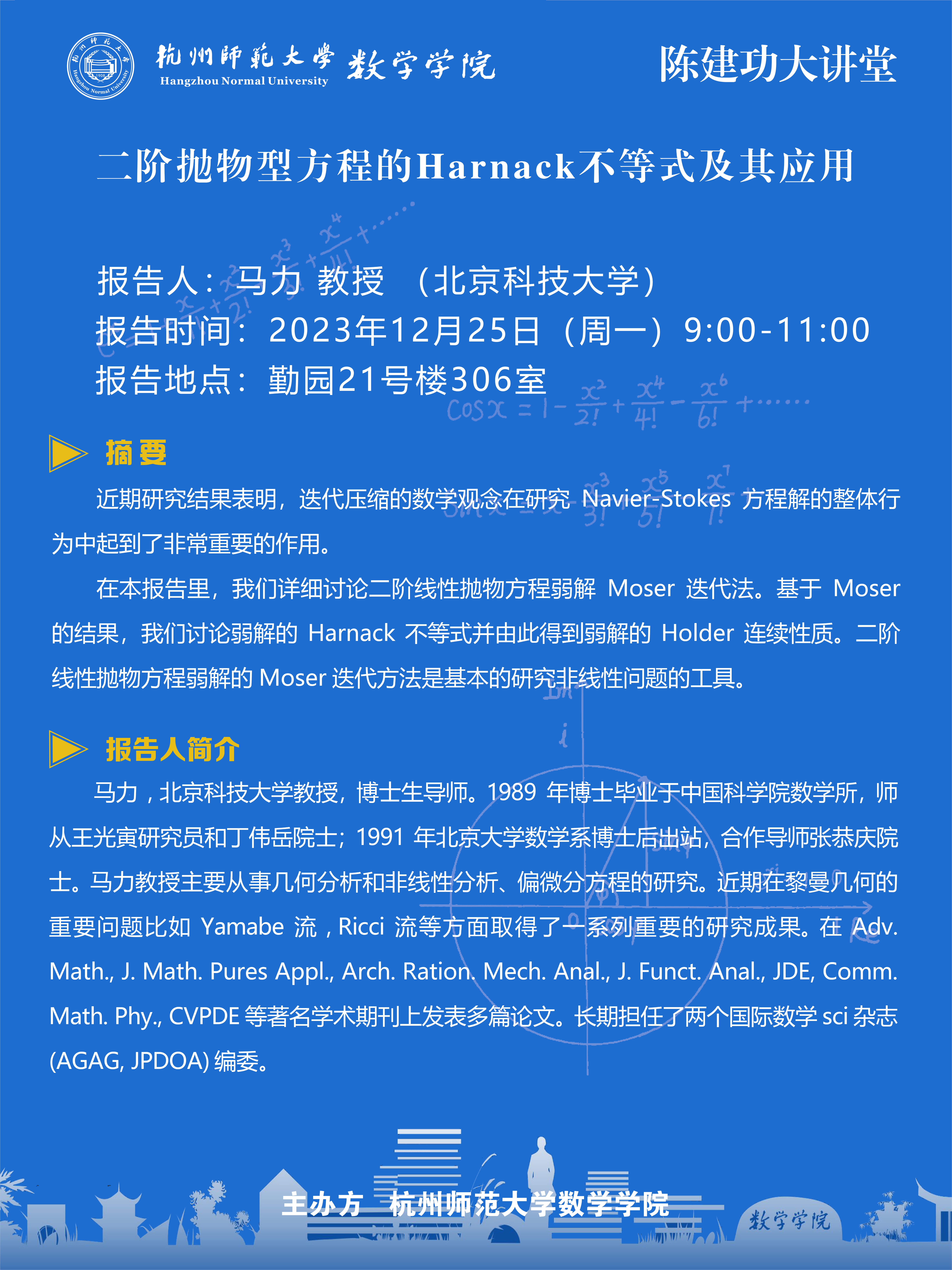 陈建功大讲堂:二阶抛物型方程的Harnack不等式及其应用
