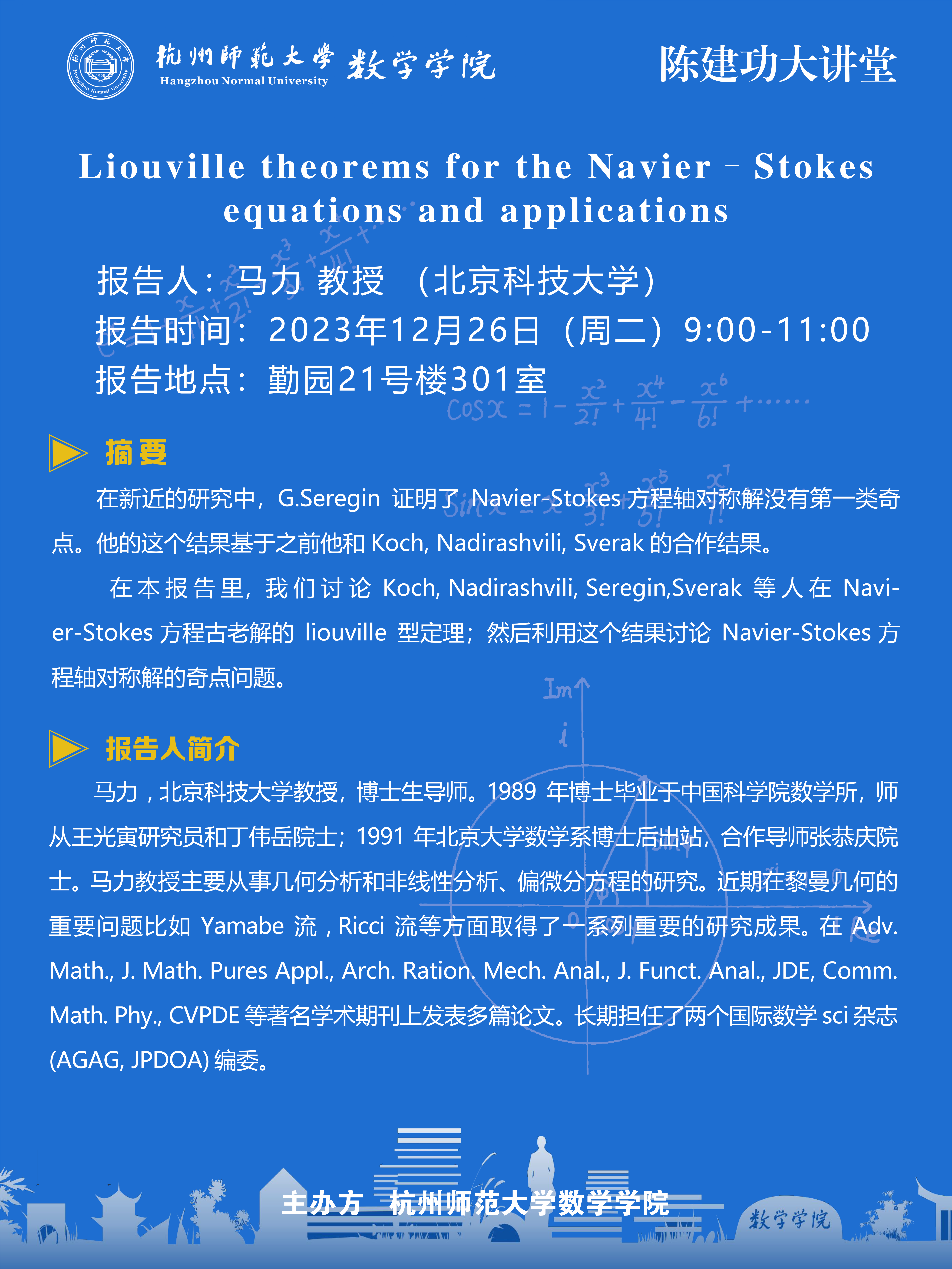 陈建功大讲堂:Liouville theorems for the Navier–Stokes equations and applications