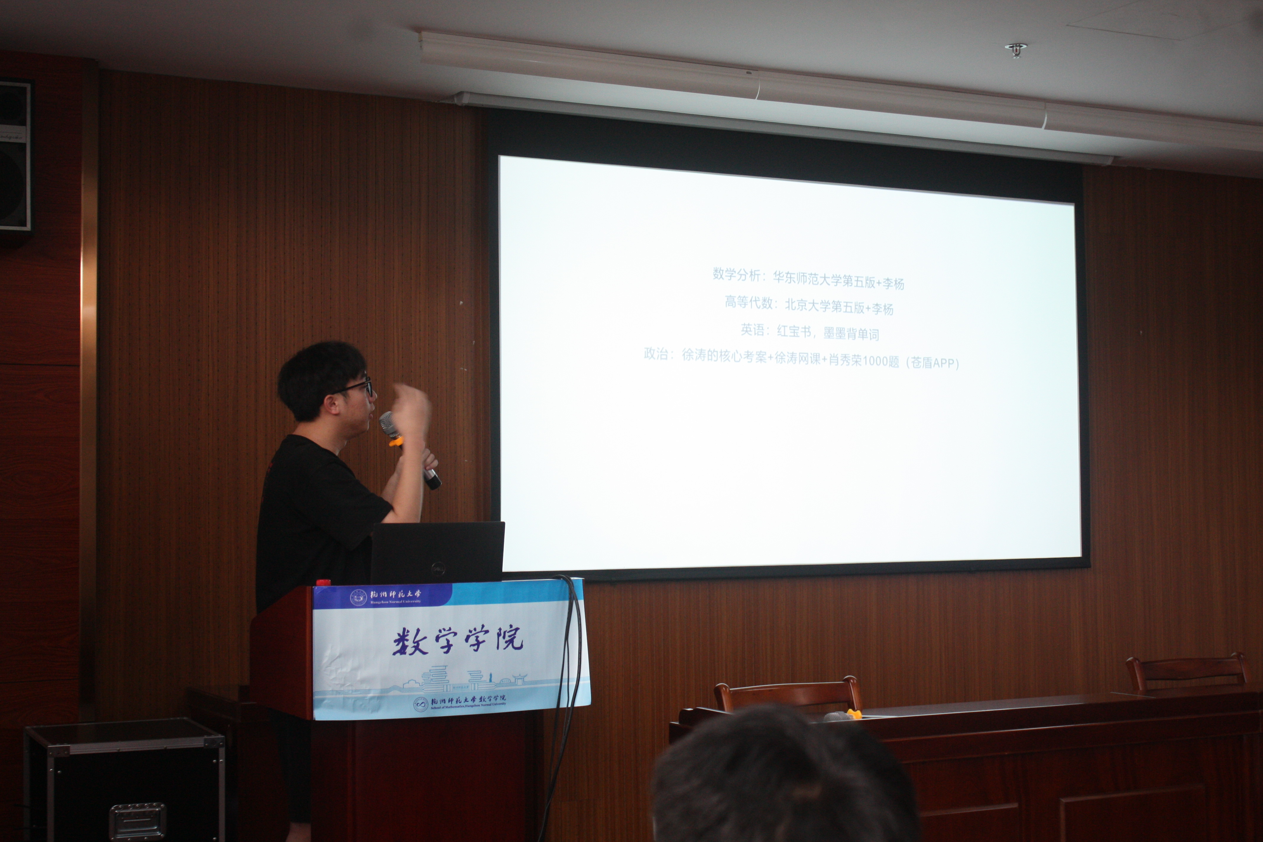 而后由上岸南京师范大学的周德益为同学们分享,他主要从“为什么考研”“择校过程”“谈谈南师”“备考经历”这四个角度展开。对于择校方面,他告诉同学们要参考数学学科评级的排名,挑选出自己感兴趣的四虎 ,查询这些四虎 往年的招生人数、报录比等等,参考这些信息,列出二次名单,并且对其进行划分。此外他还分不同的时间阶段讲述政治英语专业课的不同安排,特别强调了数分高代的学习和重要性。