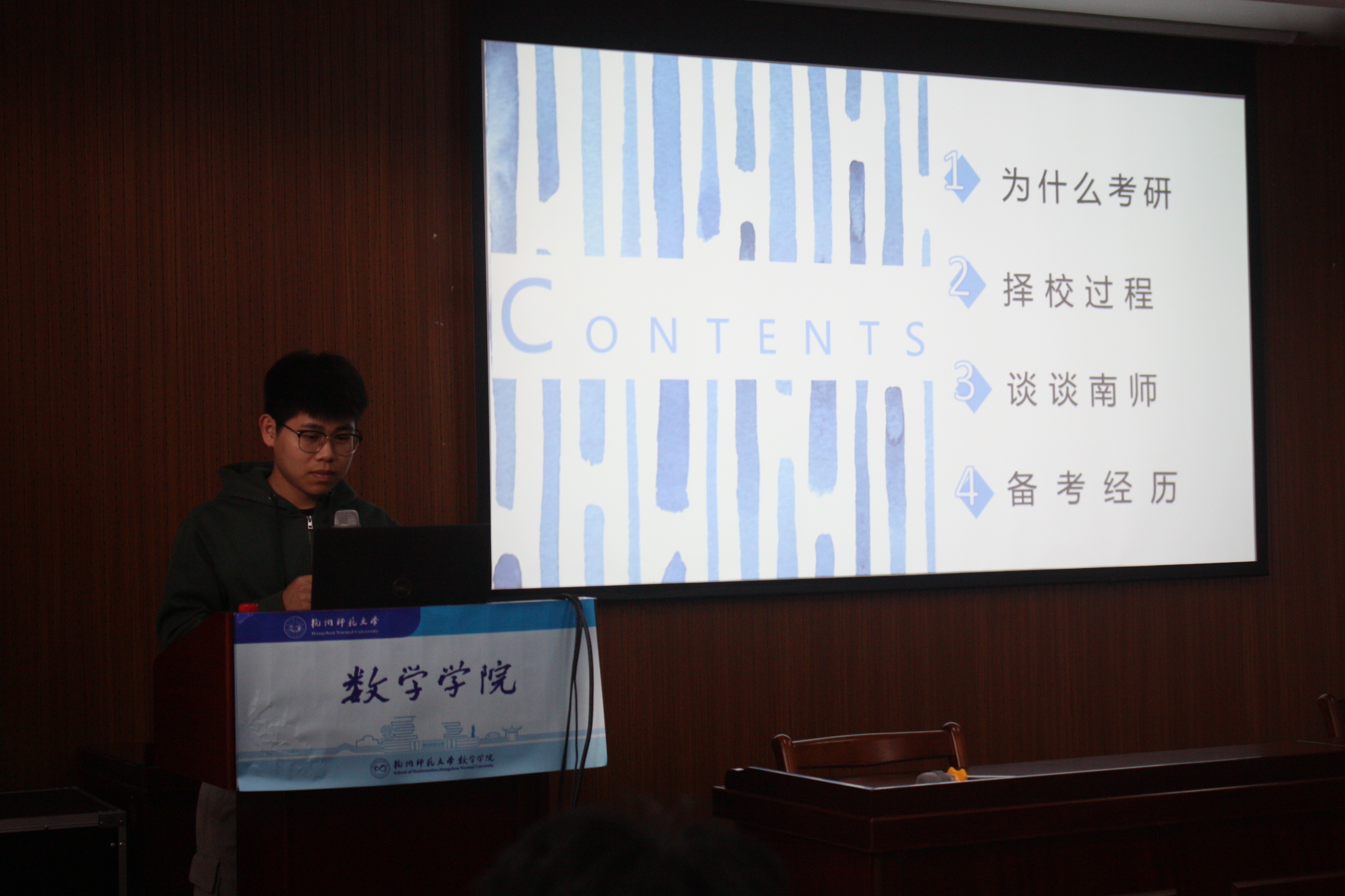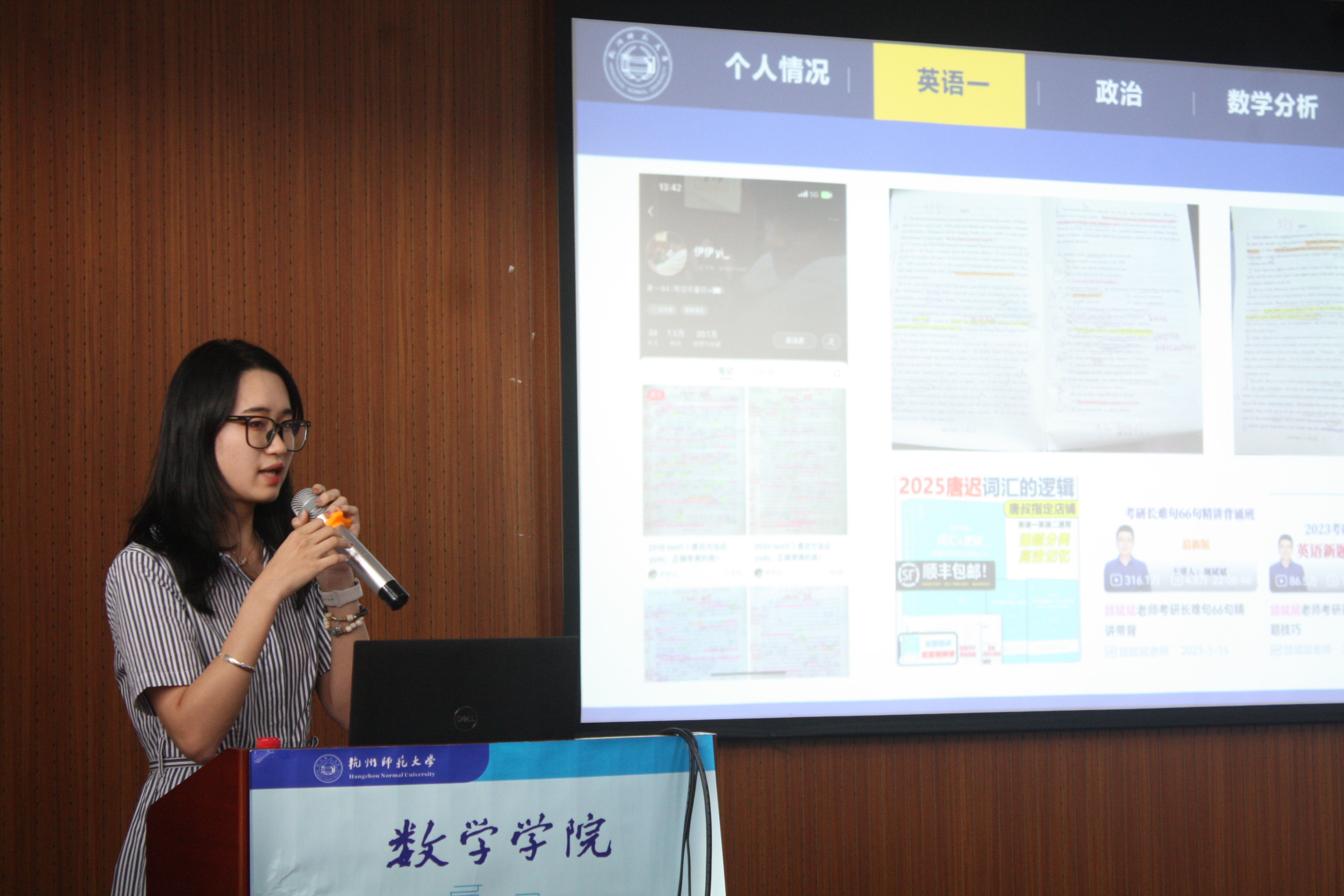 最后是上岸本校的唐思源做分享,她虽然准备考研的时间只有3个月,以及本科阶段学习的内容和考研所需的专业课存在差异,但凭借她稳定的心态和惊人的毅力,成功上岸了杭州师范大学。她给在场的同学们几句发自内心的叮嘱:不要和他人比较,复习进度不代表一切,决定考研复习就要静得下心学习等等。