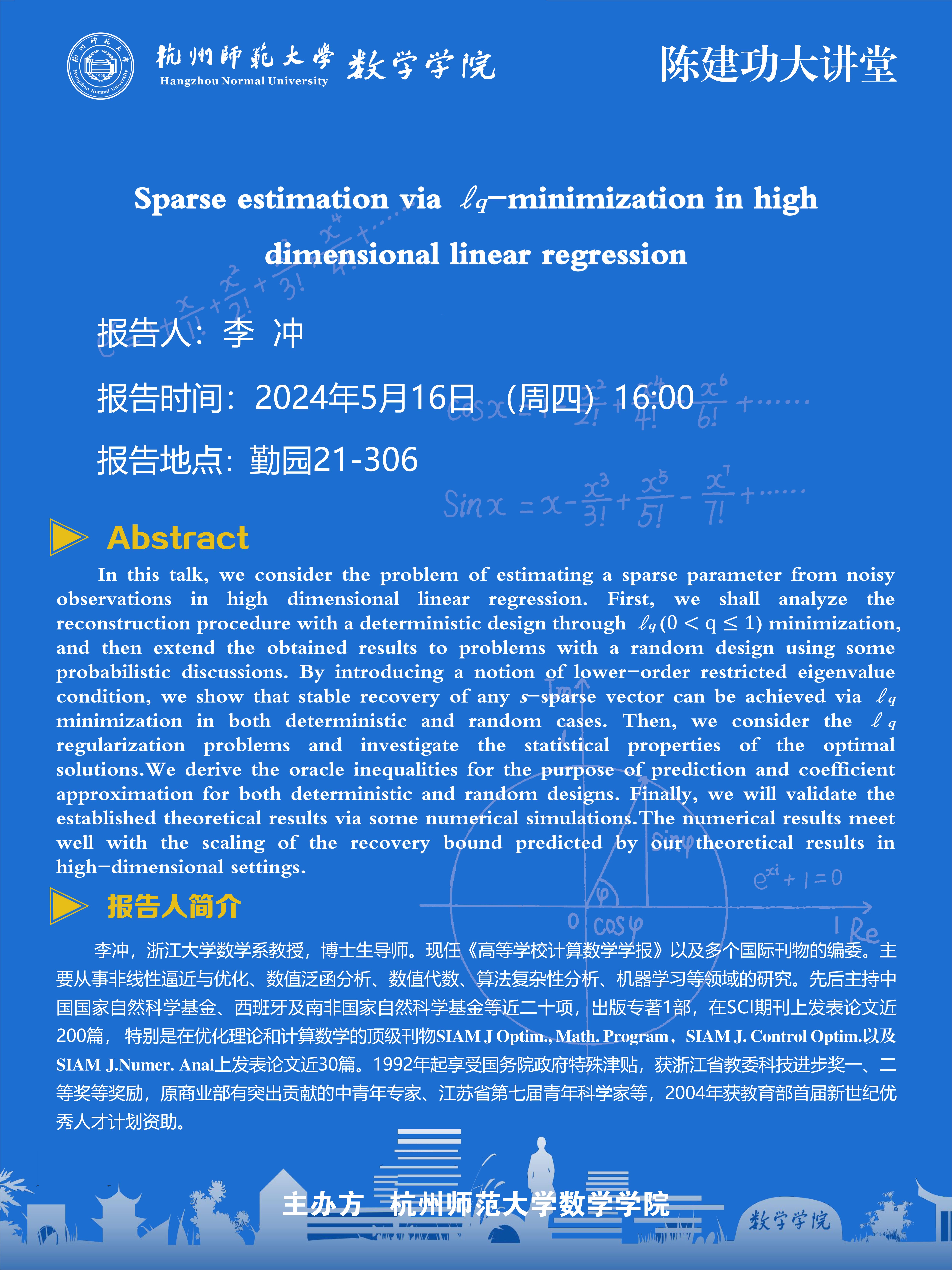 陈建功大讲堂(2024-47):Sparse estimation via L_q-minimization in high dimensional linear regression