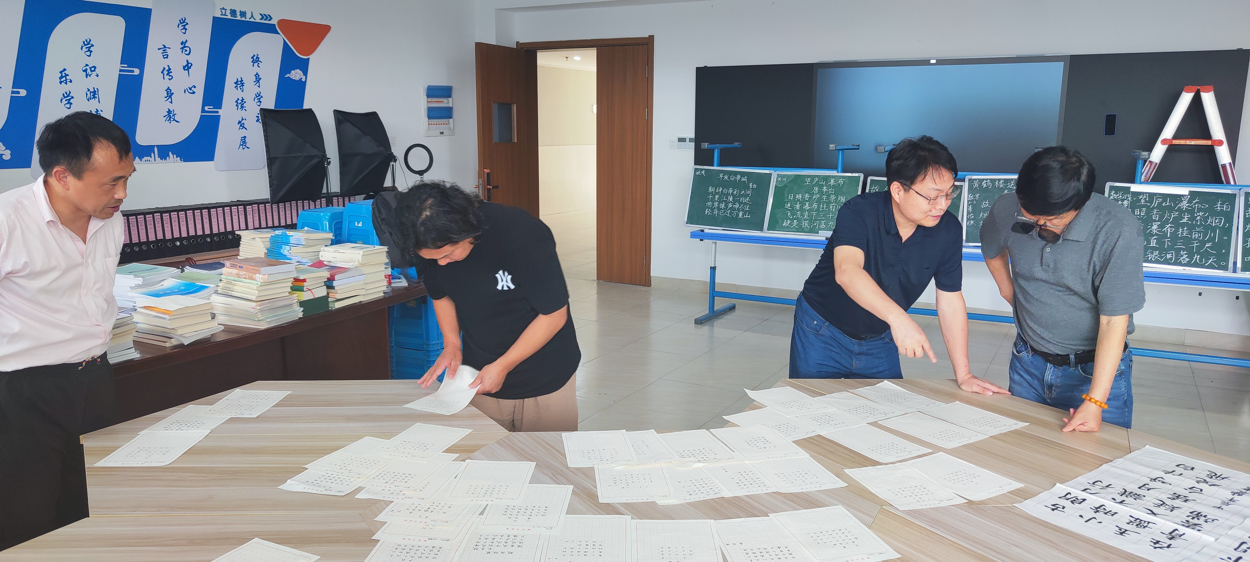 5月15日,在勤园21号楼进行了比赛的决赛。决赛邀请了数学学院副院长虞旦盛、数学学院继续教育中心主任王胜平、经亨颐教育学院艺术教育系副主任叶剑波、学校教学督导韦宝荣担任评委。评委组一致认为今年的参赛作品水平很高,经过评审,最终陈晨、张书赫获得毛笔字特等奖,李怡燃、卢宋宁获得粉笔字特等奖,黄智慧等5名同学获得硬笔字特等奖,另各有一等奖二等奖三等奖若干(获奖名单请查看附件)。