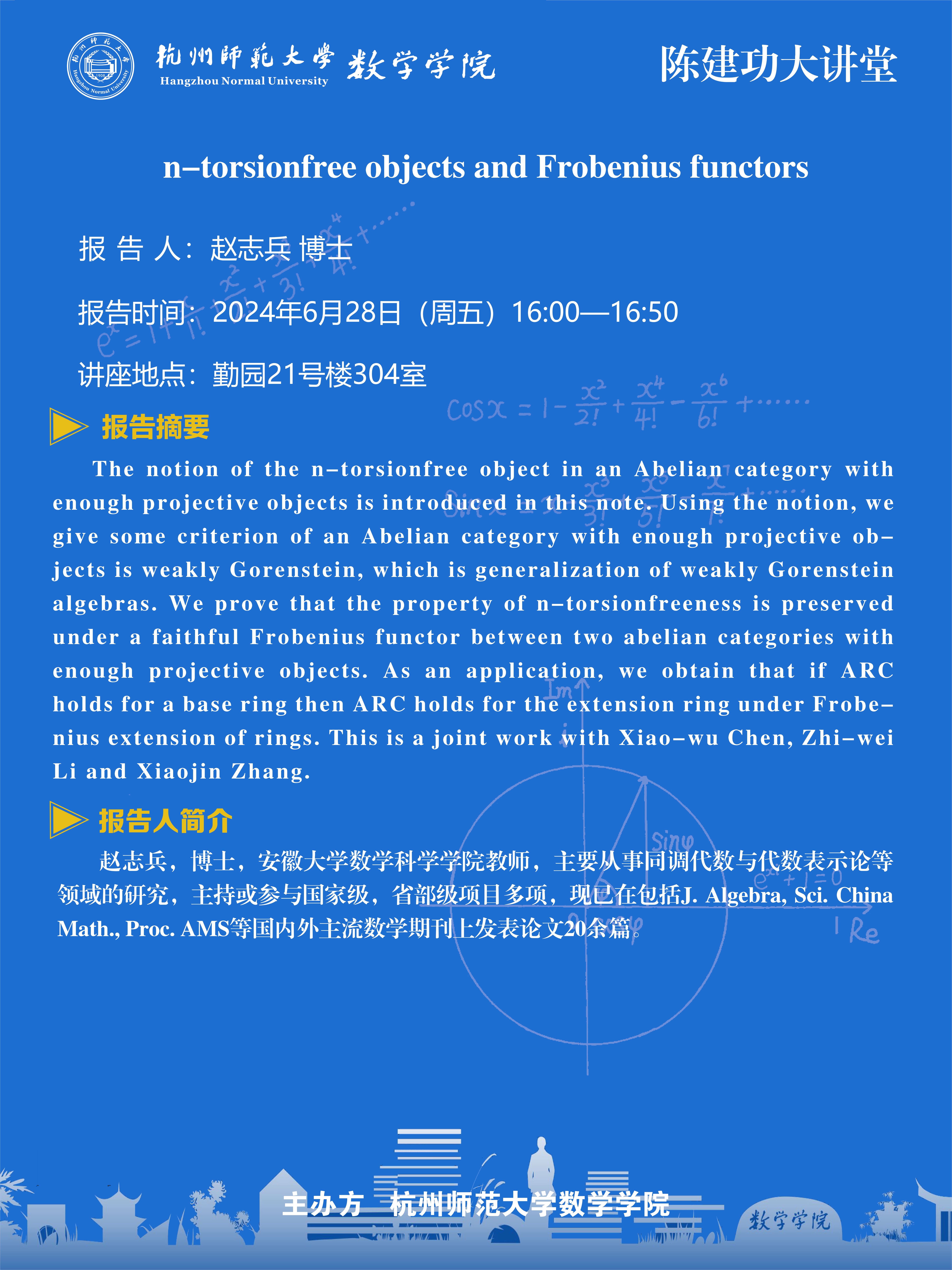陈建功大讲堂(2024-100):n-torsionfree objects and Frobenius functors