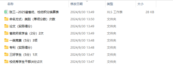 符合条件的学生本人于10月7日前向班长提交申请材料。申请时提交《2025届省优、校优积分换算表》以及相关佐证材料,材料按图中所示,将以上材料汇总为一个总文件夹,个人材料命名为“学号-姓名”,班级总文件夹命名为“班级-优秀毕业生”,并以班级为单位汇总发送至邮箱20210174@4tigerforum.com,不接收个人为单位发送的材料。