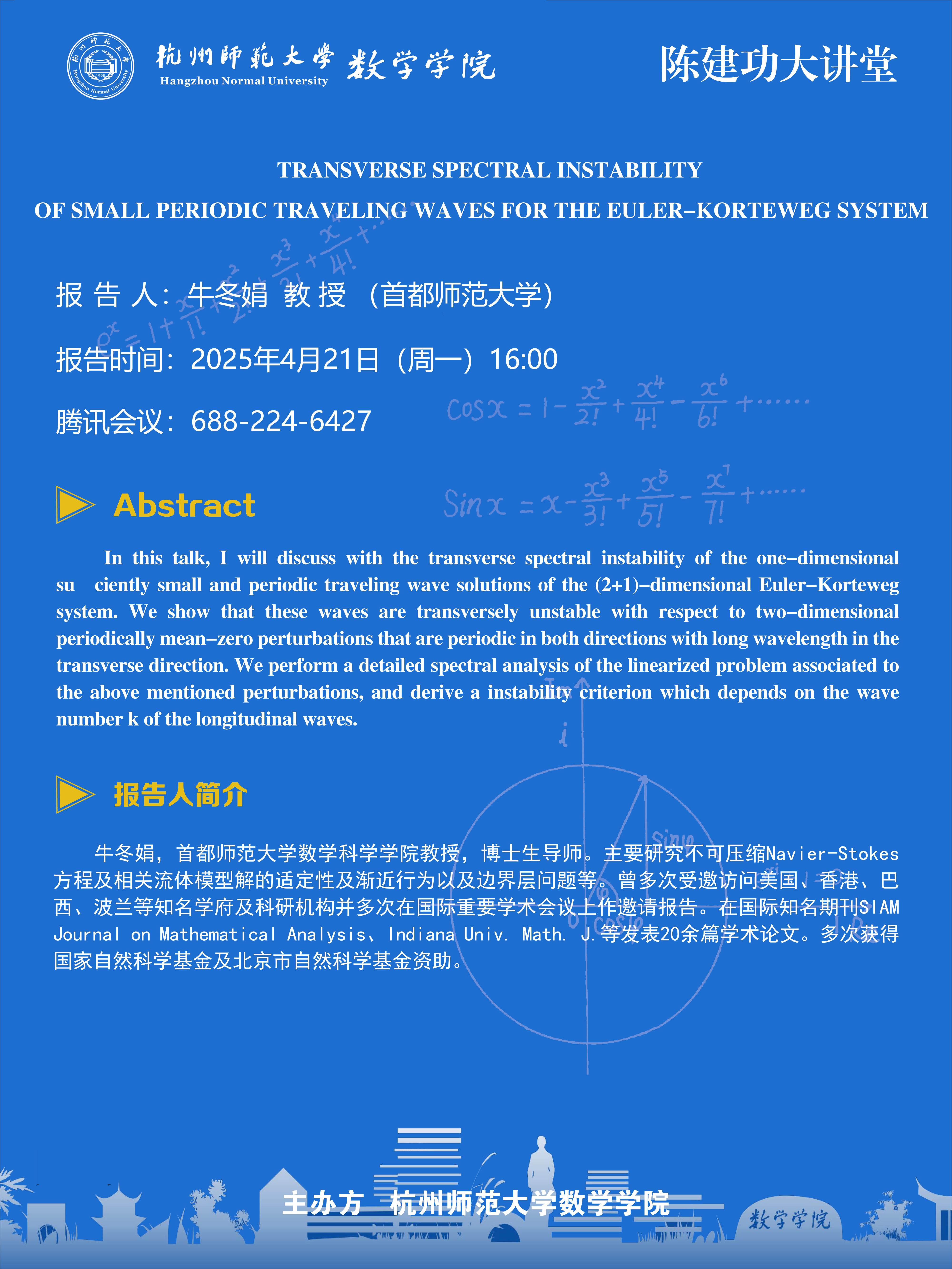 陈建功大讲堂(2025-21):TRANSVERSE SPECTRAL INSTABILITY OF SMALL PERIODIC TRAVELING WAVES FOR THE EULER-KORTEWEG SYSTEM