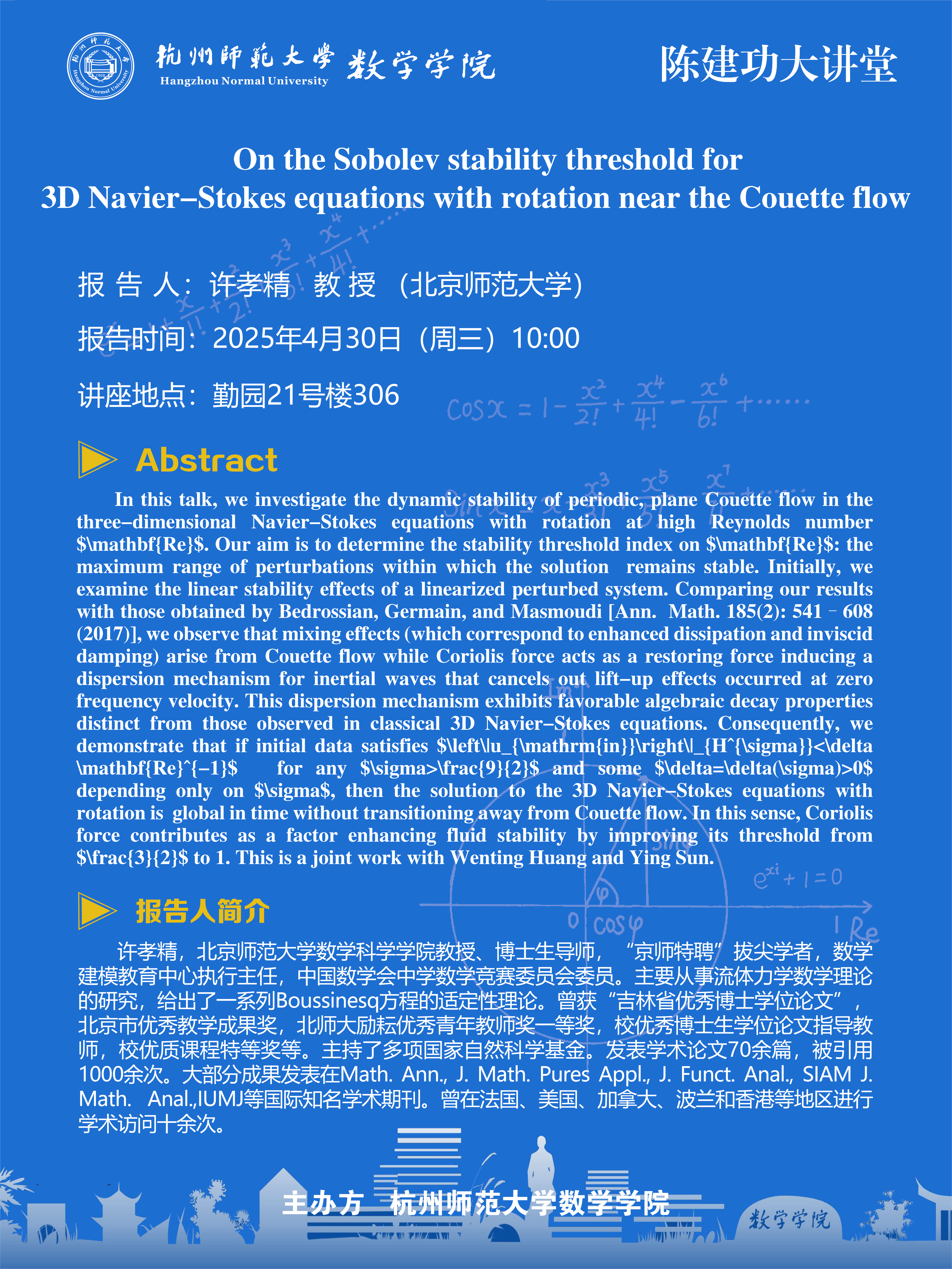 陈建功大讲堂(2025-23):On the Sobolev stability threshold for 3D Navier-Stokes equations with rotation near the Couette flow