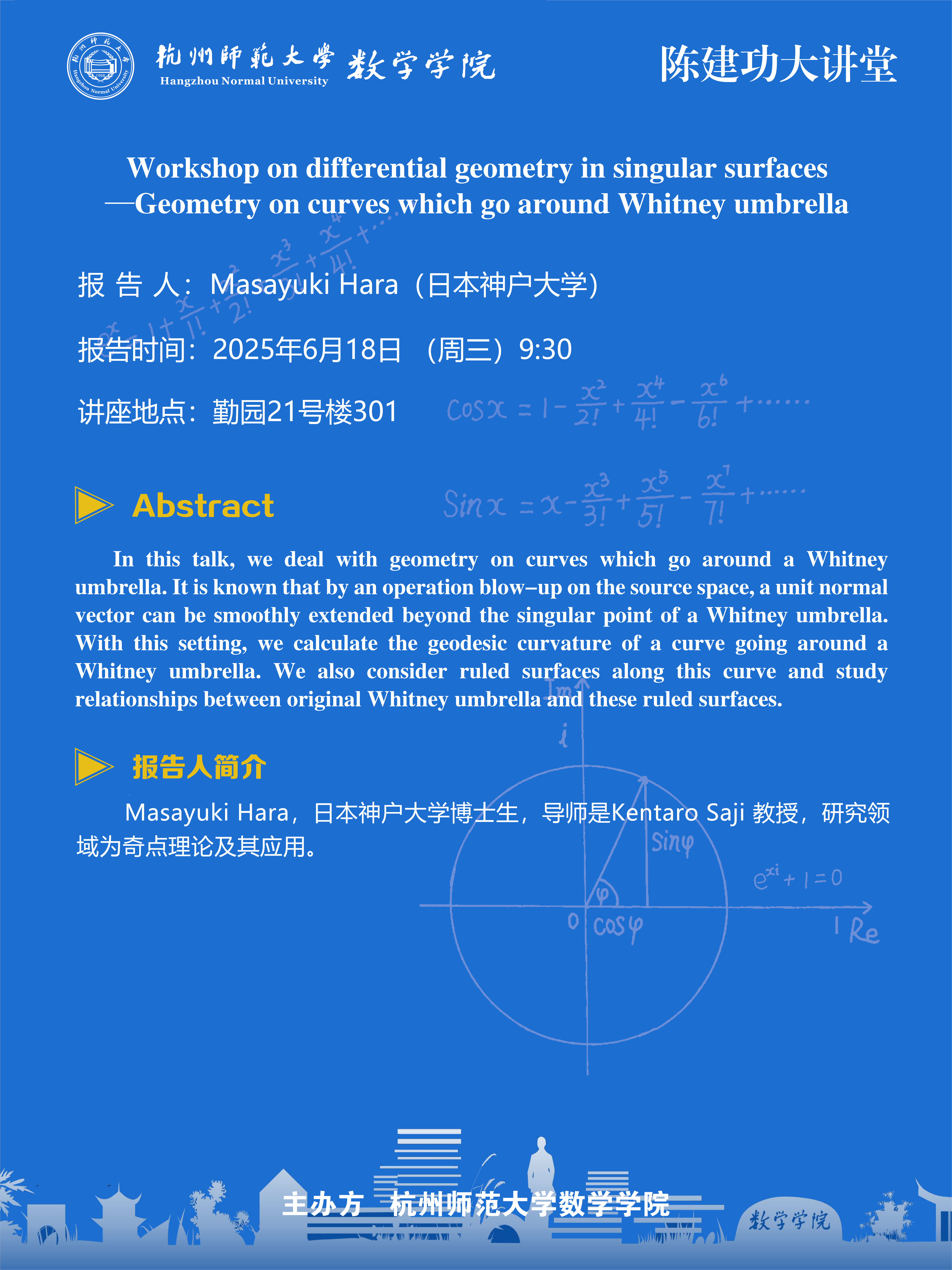 陈建功大讲堂(2025-53):Workshop on differential geometry in singular surfaces— Geometry on curves which go around Whitney umbrella